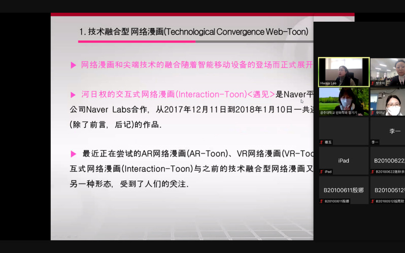 12月22日下午,韩国国立公州大学艺术公司教授、博士生导师李华子应邀为太阳成城集团tyc234cc古天乐的师生们开展了一场题为“韩国新媒体技术融合型文化内容产业案例分析”的学术讲座。讲座通过远程会议的方式开展,由太阳成城集团tyc234cc古天乐副经理袁潇主持,部分教师代表及动画专业二年级员工到场聆听了讲座,另有部分师生通过线上聆听了讲座。