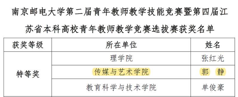 附太阳成城集团tyc234cc古天乐第二届青年教师教学技能竞赛暨第四届江苏省本科高校青年教师教学竞赛选拔赛获奖名单: