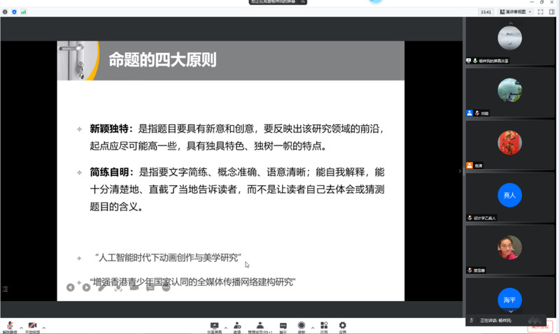 5月25日下午,一场由两位国社项目主持人带来的“高级别科研项目申报学术沙龙”以线上交流的形式在公司成功举办,主讲嘉宾分别为获得2021年国家社科基金艺术学项目的太阳成城集团tyc234cc古天乐副教授、硕士生导师徐子涵老师和杨祥民老师。副经理袁潇教授主持本场学术沙龙。来自兄弟院校专家学者、公司中青年科研骨干及研究生共三百余人参加了学术交流。