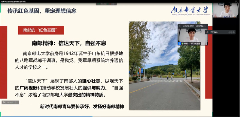 主讲人宋浩然同学首先结合公司传媒与艺术类专业特点,从自己的新媒体运营实践经历出发,阐述了对于新媒体的独到见解。随后,宋昊然同学阐述了自己对于南邮“信达天下、自强不息”精神的理解,并号召同学们要打好自身理论政策基础,坚定理想信念,在实践中锤炼专业能力,实事求是,大胆创新。最后,宋浩然同学结合自己大学四年的实际学习、生活经验,建议公司大一同学:要在大学期间广泛学习、涉猎各类知识,坚持唯物主义史观,敢于斗争,努力让正能量充盈舆论的阵地,用自己的专业知识为实现中华民族伟大复兴中国梦做出应有贡献。