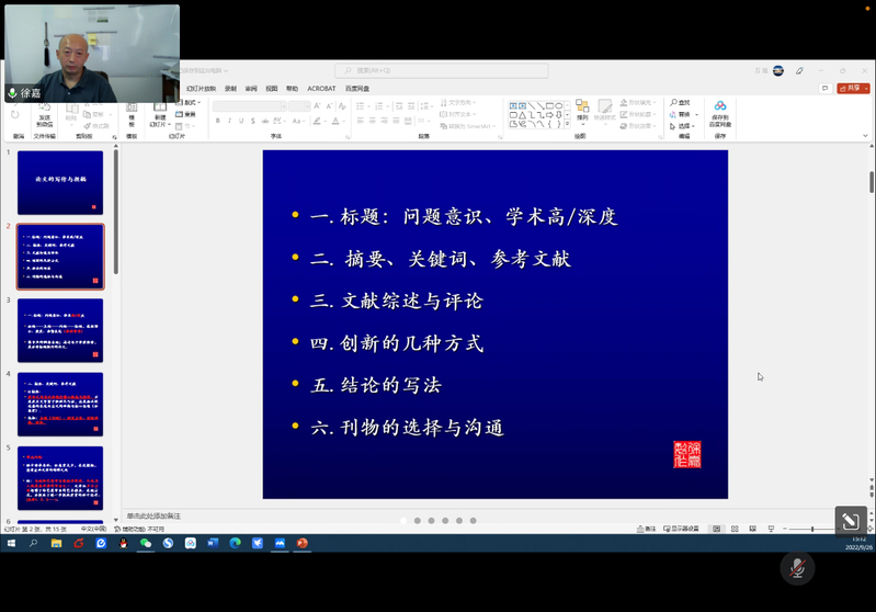 徐嘉教授从“论文的写作与投稿”的主题出发,从标题、摘要、文献综述与评论、创新方式、结论、刊物选择与沟通等六个方面进行了详细的讲解。在介绍结论的写法时,徐嘉教授以“论龙门石窟中唐代造像的艺术特征”为例,提出了结论写作的两点要求,详尽地介绍了一篇高质量论文的构成与写作方法。