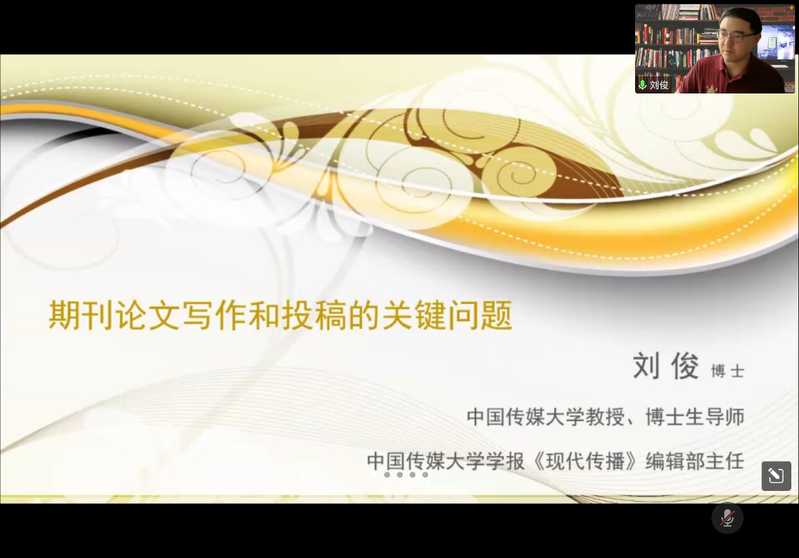 刘俊教授分别以新传学科和艺术学科为例,介绍了“我国学术期刊的类别划分”,结合具体的期刊案例,向师生们介绍了学术期刊论文写作的要求与禁忌、融媒和智媒时代的学术期刊编发等。在谈及《现代传播》的基本情况时,刘俊教授从历史发展、发文领域、定位特色、投稿要求等方面具体进行介绍。