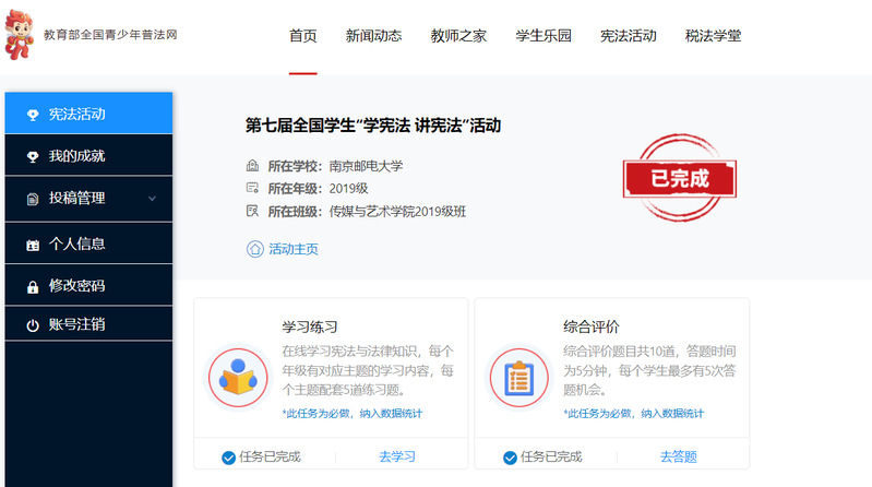 此次“宪法卫士”主题教育活动,全院参与率达到100%,党员和入党积极分子全部完成答题测试。同学们通过亲身参与,对宪法有了进一步的认识与理解。