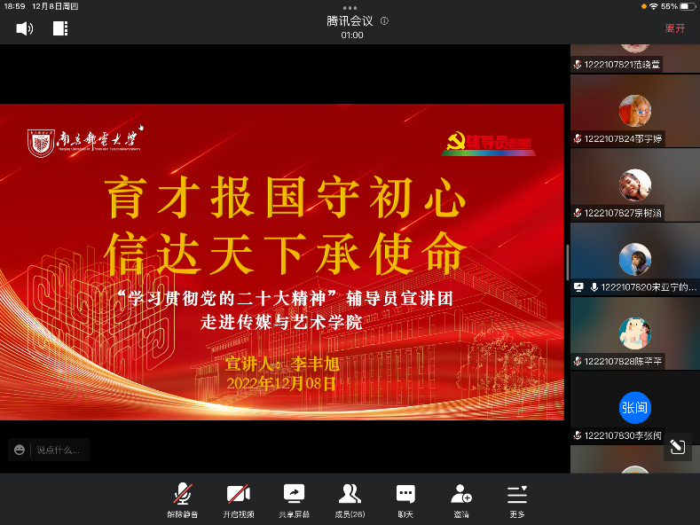 报告开始以党的二十大主题《高举中国特色社会主义伟大旗帜为全面建设社会主义现代化国家而团结奋斗》引出伟大的建党精神,接着,以南邮发展历程展现“忠贞不渝、使命必达”的战邮精神,传承红色基因,赓续红色血脉。随后强调教育、科技、人才是全面建设社会主义现代化国家基础性、战略性支撑。要推进文化自信自强,精神引领风尚;科技自立自强,人才驱动创新;进一步推动公司“双一流”和江苏高水平大学建设征程,永续辉煌。整个报告将二十大精神和南邮校史相结合,为我们带来一场具有创新性的分享学习。