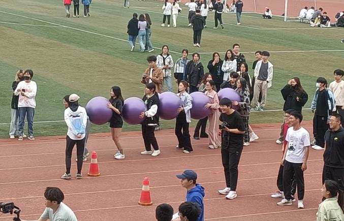 随着裁判的一声哨响,比赛热火朝天的进行着,赛场上每个团队都不甘示弱,各不相让。率先进行的是折返运转乾坤,公司运动员齐心协将比自己还要大几倍的大球举过头顶,采用男生在前后主要承重向前,女生在两侧主要托举防止大球滚落。