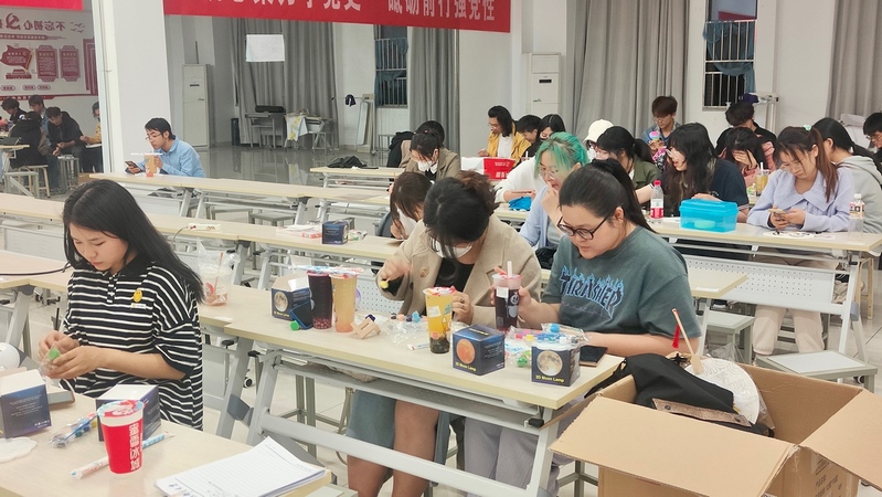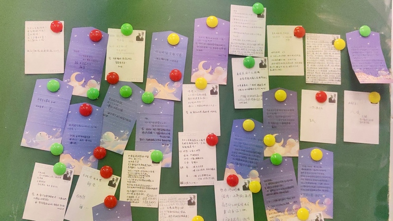 活动分为两个模块进行。首先是“解忧杂货铺”活动,每位同学从木箱中随机抽取一张写有他人烦恼的卡片,然后写下对这些烦恼的回答,并将卡片贴在白板上,寻求全体同学的不同视角和解答。这个环节增强了班级同学间的心理互助与支持,让大家感受到了班级同学间的情感支持与关怀,同时提升了同学们以更多元的视角解决现实问题的能力。接下来是“星球制造”活动,同学们自行选择心仪的星球模型,并用水彩工具进行上色。在绘制星球灯的过程中,同学们展现了个性化的创意,同时释放了学业压力,提升了他们的艺术表达能力,激发了专业想象力和创造力。