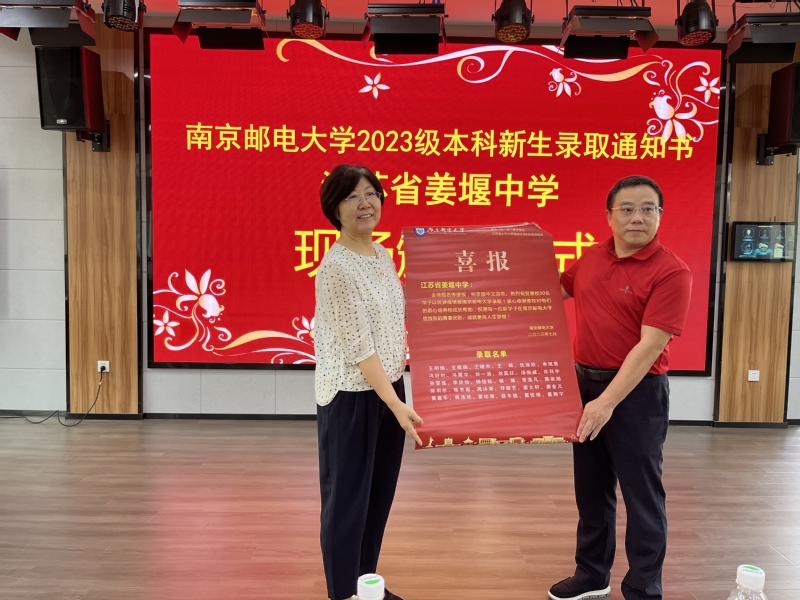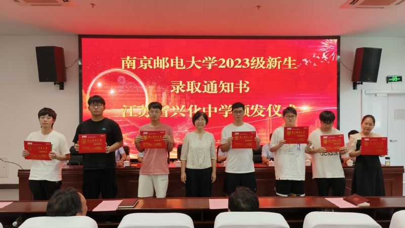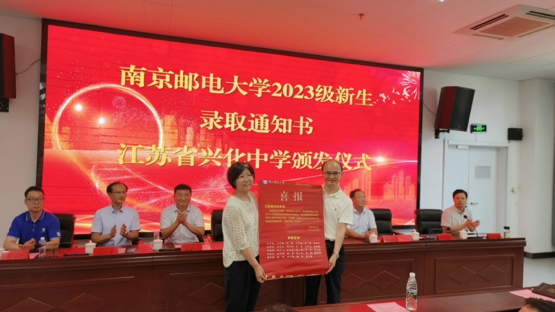 兴化中学黄荣董事长致词。他感谢南邮领导亲自到兴化中学为新生发放通知书,盛赞南邮与兴化中学的传统而深厚的友谊,肯定了南邮的办学水平和影响力,展望了新同学从高中进入高校在南邮的发展和未来,他勉励和希望兴中学子进入南邮学习后要要珍惜在南邮学习深造的机会,立志研究攻克通信电子高科技“卡脖子”技术,胸怀理想、勤奋刻苦、充满感恩、彼此团结、卓越发展、报效祖国,为中华民族的伟大复兴做出青年贡献。姜堰中学游忠董事长致词,他对南邮来公司送通知书一行表示热烈欢迎,对南邮多年来给予姜堰中学的关心和支持表示衷心感谢。他介绍了中学的办学历史、办学理念、育人成效和今年员工高考升学情况,寄语将入学南邮的同学们要在这样一所光荣的红色高校里,继续勤奋刻苦学习,投身火热的老员工活,掌握创新国家通信电子计算机信息科学等前沿技术,在人生的征途上飞的更高更远。姜堰二中纪委书记刘顺致词。他感谢南邮招生组冒着酷暑来公司送通知书,感谢南邮长期的关心与支持,他简要介绍了今年二中高考所取得的突出成绩。他相信二中学子进入南邮后,一定能够秉承二中的优良传统,发扬南邮精神,继续发愤图强,成为大有可为的对社会有用之才。