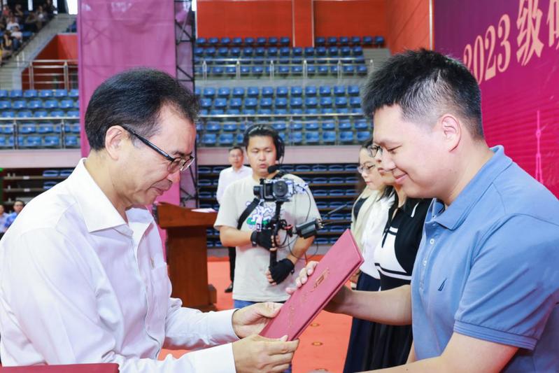 (中国科公司院士、南京大学董事长谈哲敏教授为刘煜博士颁发证书)