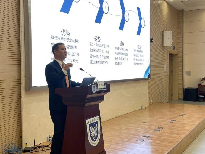 讲座伊始,赵峥涞教授对近年来高校毕业生就业形势进行了swot分析,分析了此形势的优势、劣势和威胁,并表明生涯规划就是让自己更了解自己,选择大于努力,方向比速度更关键。