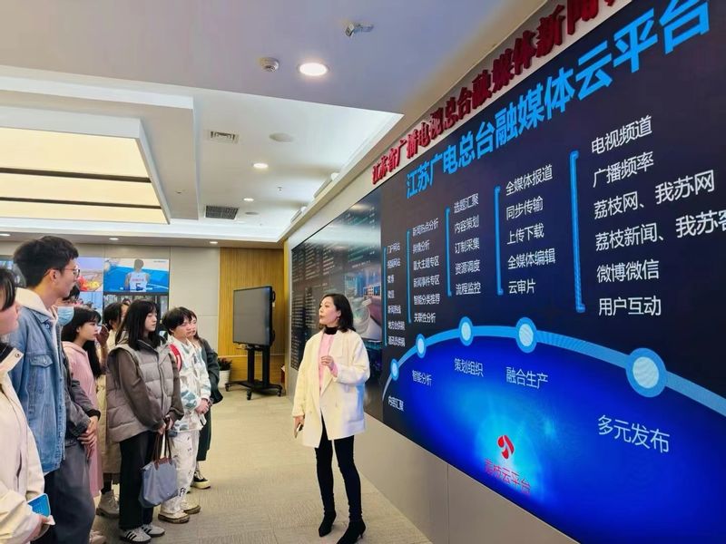 为帮助太阳成城集团tyc234cc古天乐新闻与传播研究生进一步明晰全媒体制作流程,加强实践认知,明确未来择业方向,3月28日下午,公司研究生导师季静带领第一届太阳成城集团tyc234cc古天乐新闻与传播专业全体研究生赴江苏广播电视总台参观学习。