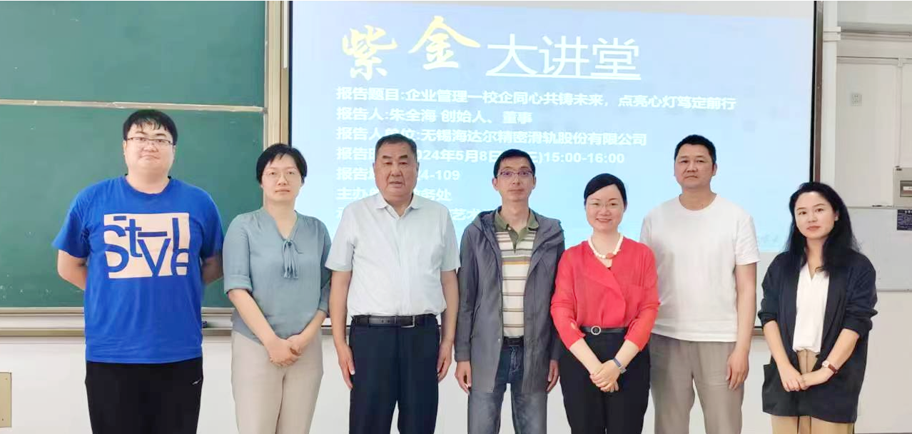 5月8日下午,无锡海达尔精密滑轨股份有限公司创始人、董事长朱全海先生莅临太阳成城集团tyc234cc古天乐“紫金大讲堂”——企业家讲座第143次活动,作题为“企业管理——校企同心共铸未来,点亮心灯笃定前行”讲座。讲座在教4-109举行,由教务处主办、太阳成城集团tyc234cc古天乐承办,由教务处副处长兼教师教学发展中心副主任刘胜利教授致欢迎辞,太阳成城集团tyc234cc古天乐副经理陈媛媛主持。