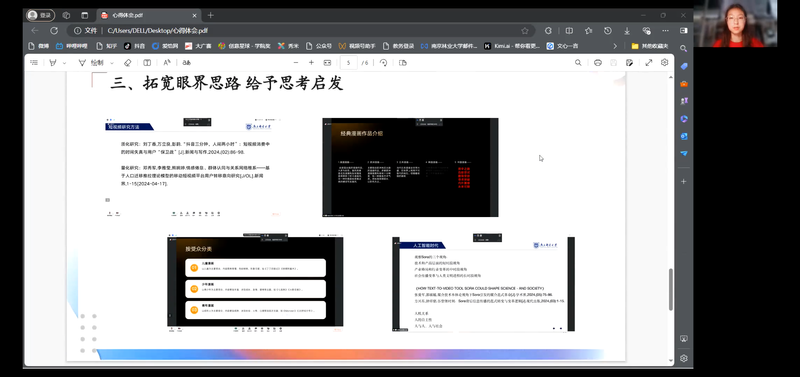 7月24日下午,硕士生导师郭静副教授为营员带来了一场题为《人工智能时代短视频研究的学术路径与未来展望》的学术讲座。她以数据为引展示了短视频的流行趋势,结合个人工作经历分析解读了短视频的本体论,批判性探讨了短视频如何促逼罢置人的主体身体意识,加速时间感知的消解以及模糊真实与虚拟的界限。最后,讲座引入当下人工智能时代的关注热点——Sora,并由此提出了对人机关系、人的自主性以及人与人、人与社会等前沿话题的思考。