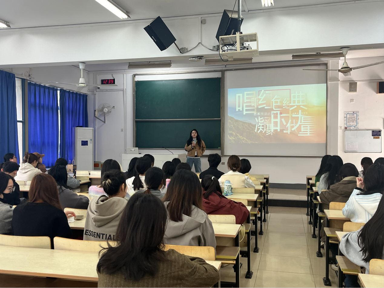 为了让大家更深入地了解红色音乐,讲座还设置了互动环节。在陶导的带领下,同学们演唱了红色经典歌曲《映山红》,用歌声表达了对党和祖国的热爱之情。