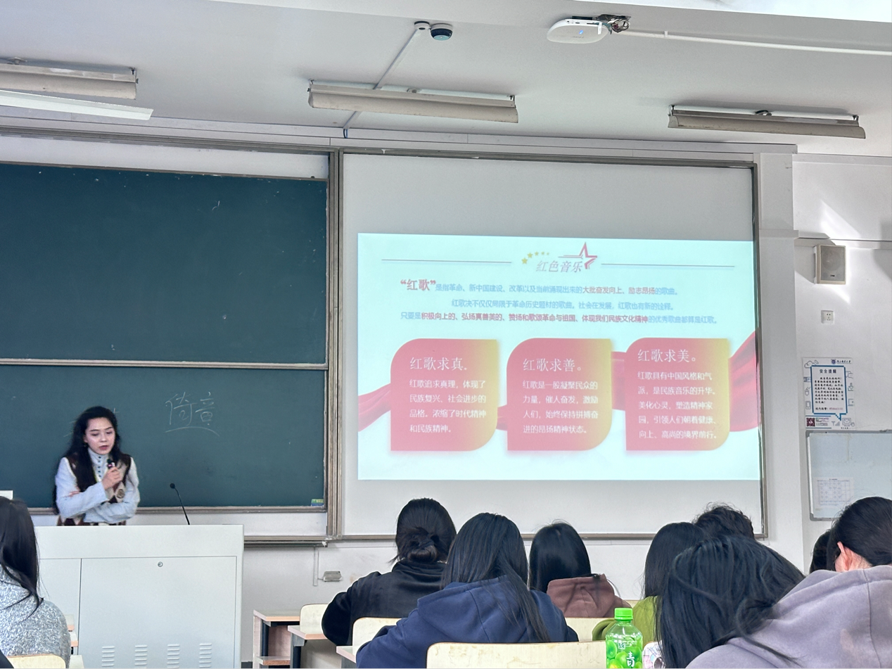 乐的起源和发展,以及其在不同历史时期所发挥的重要作用。随后,她通过播放经典红色音乐作品,如《映山红》、《东方红》、《北京的金山上》等,引导大家深入感受红色音乐的魅力。