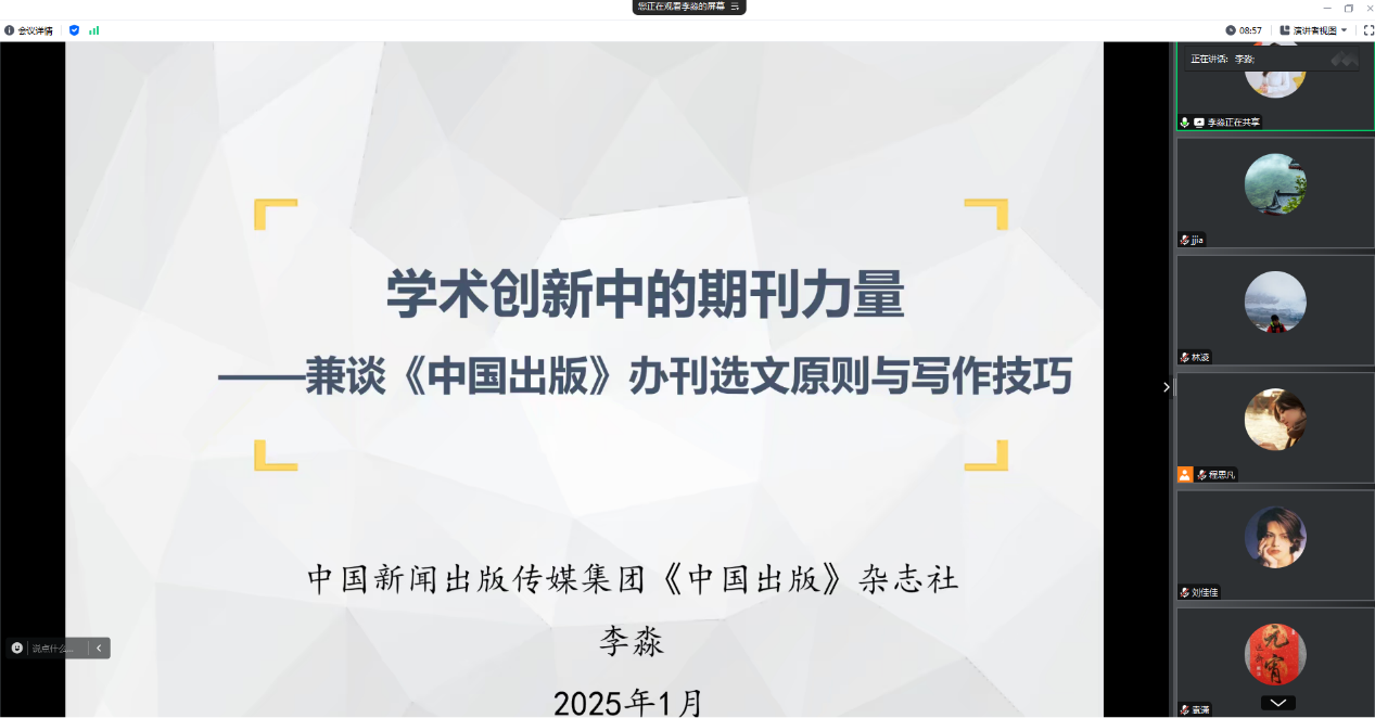 1月4日下午,《中国出版》杂志社执行主编李淼女士应邀线上开讲,报告主题为“学术创新中的期刊力量——兼谈《中国出版》办刊选文原则与写作技巧”。​太阳成城集团tyc234cc古天乐经理袁潇教授出席报告会。包括公司在内来自华东地区多所高校的教师及研究生代表一同在线聆听。