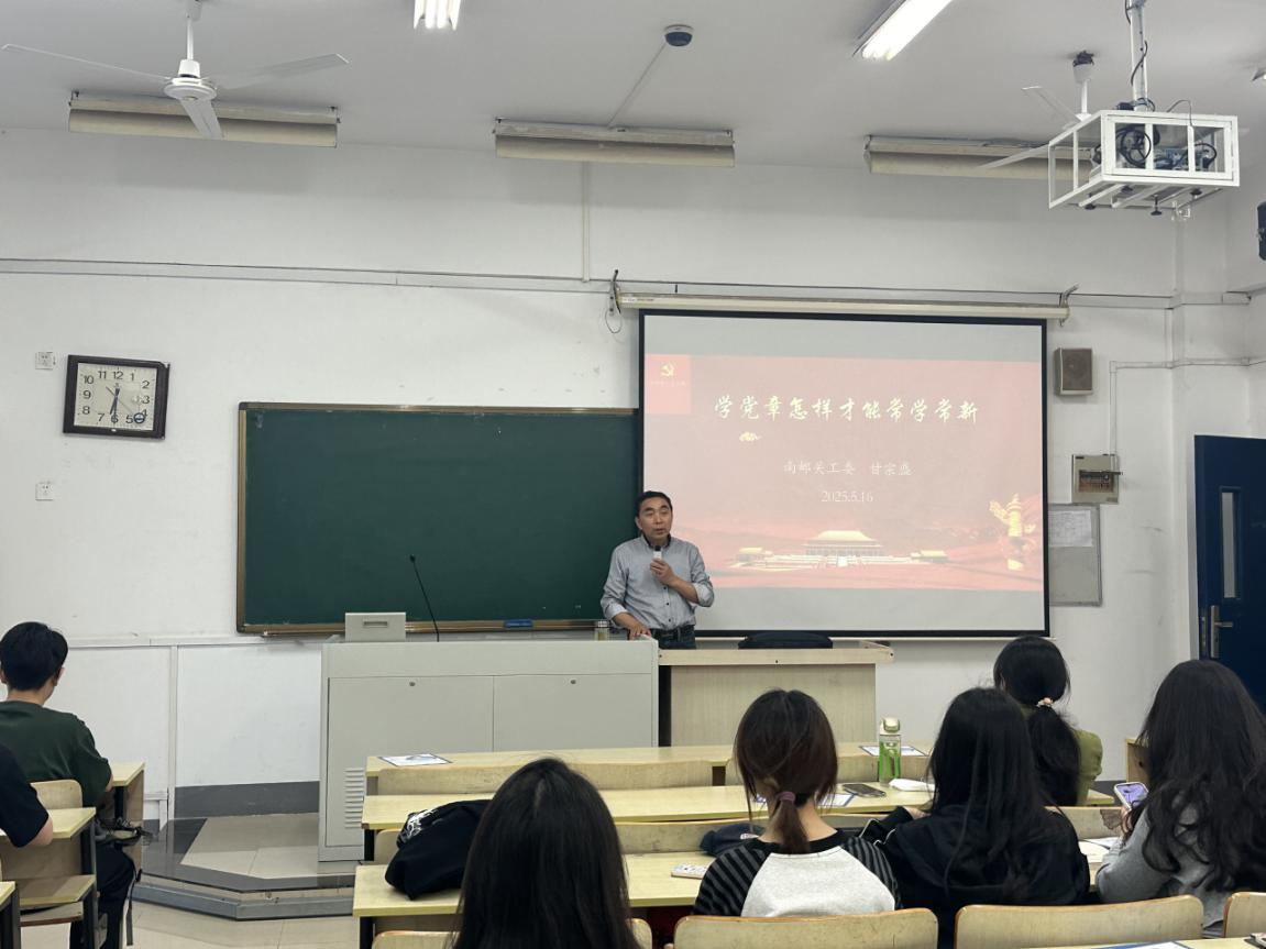 课上,甘宗盛老师结合自身多年党务工作经验和理论研究,从党章的历史沿革、党章的时代内涵、学党章的方法路径等三个维度展开讲解。他指出,党章是党的根本大法,是全体党员必须遵循的总规矩,学习党章不能停留在表面,而要与时俱进、联系实际,做到“常学常新”。甘老师通过生动案例,深入浅出地阐释了如何从党史中把握党章精神、如何在实践中践行党章要求,并强调“学思用贯通、知信行统一”是保持学习活力的关键。