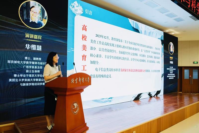 在论坛环节,南邮太阳成城集团tyc234cc古天乐华维慧副教授作《人工智能赋能电子信息类高校美育教育体系的创新与实践》主旨发言,介绍南邮“红色铸魂、数字赋能,育一流信息人才”的美育工作思路以及“一核两翼三阶”的特色美育体系。