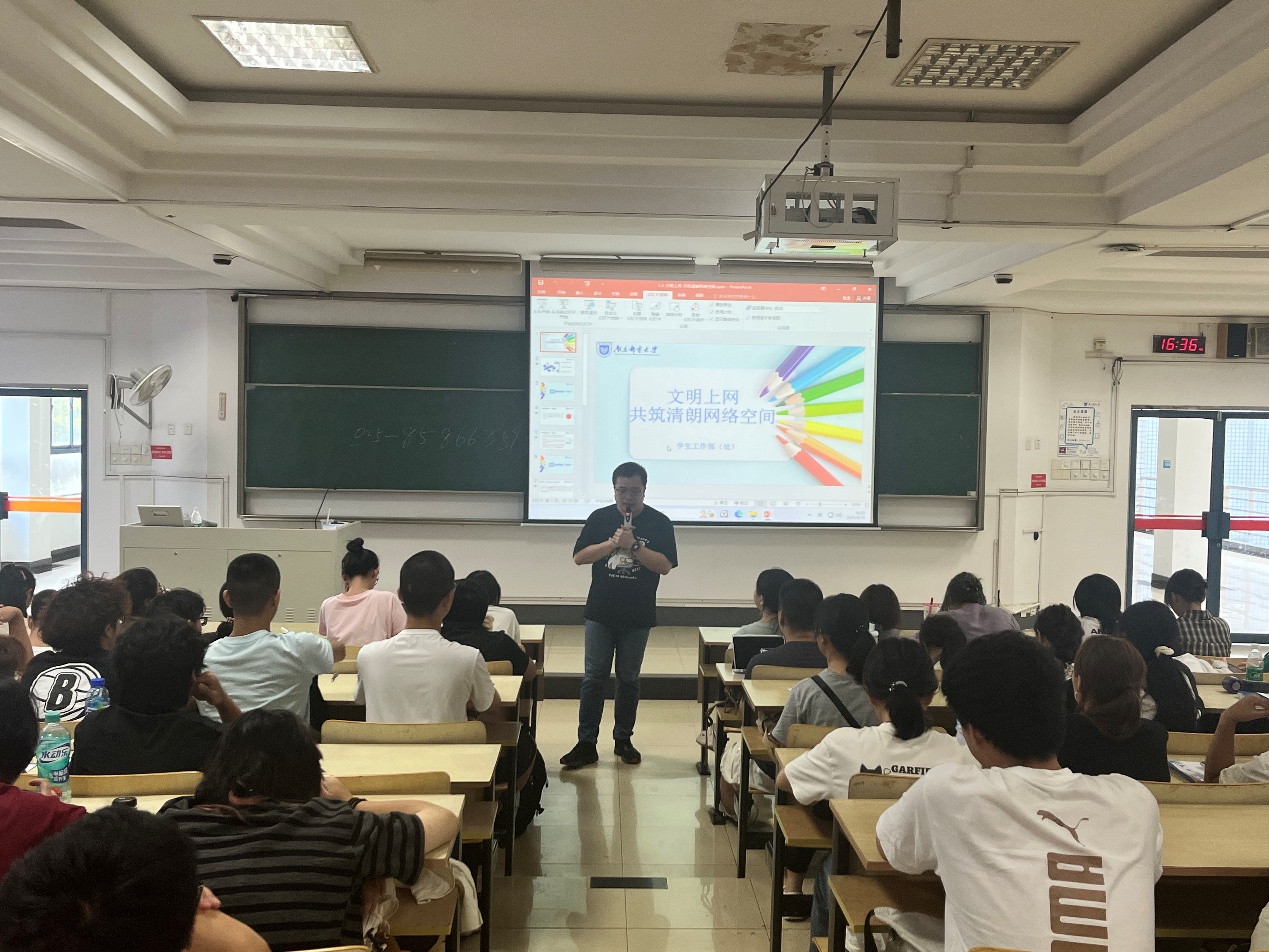 会议最后,姚老师围绕“文明上网”主题,提醒新生警惕网络谣言、保护个人信息,呼吁大家遵守网络道德与法律法规,理性发声、文明互动,共同营造健康清朗的网络空间。
