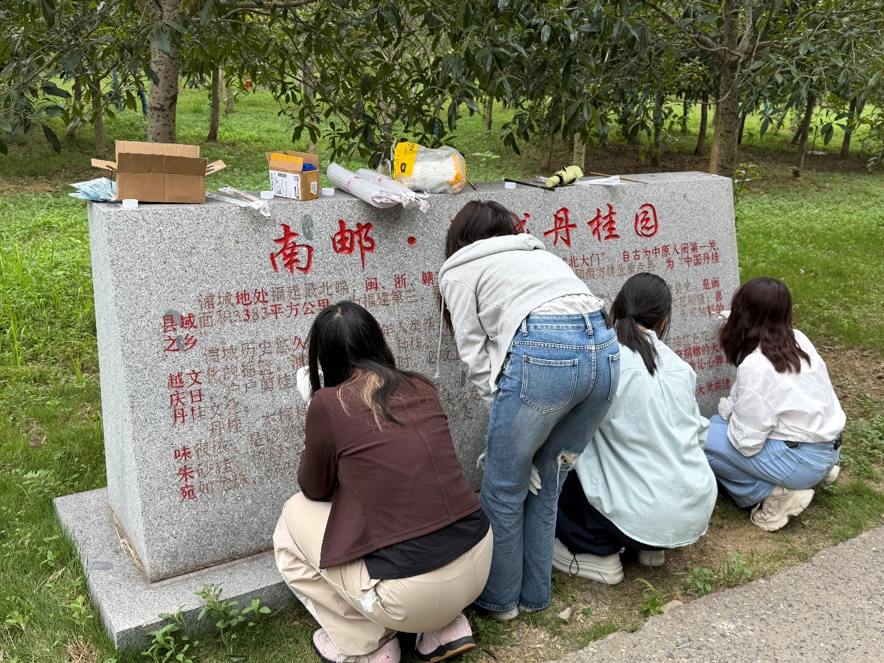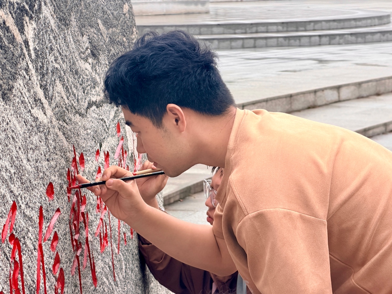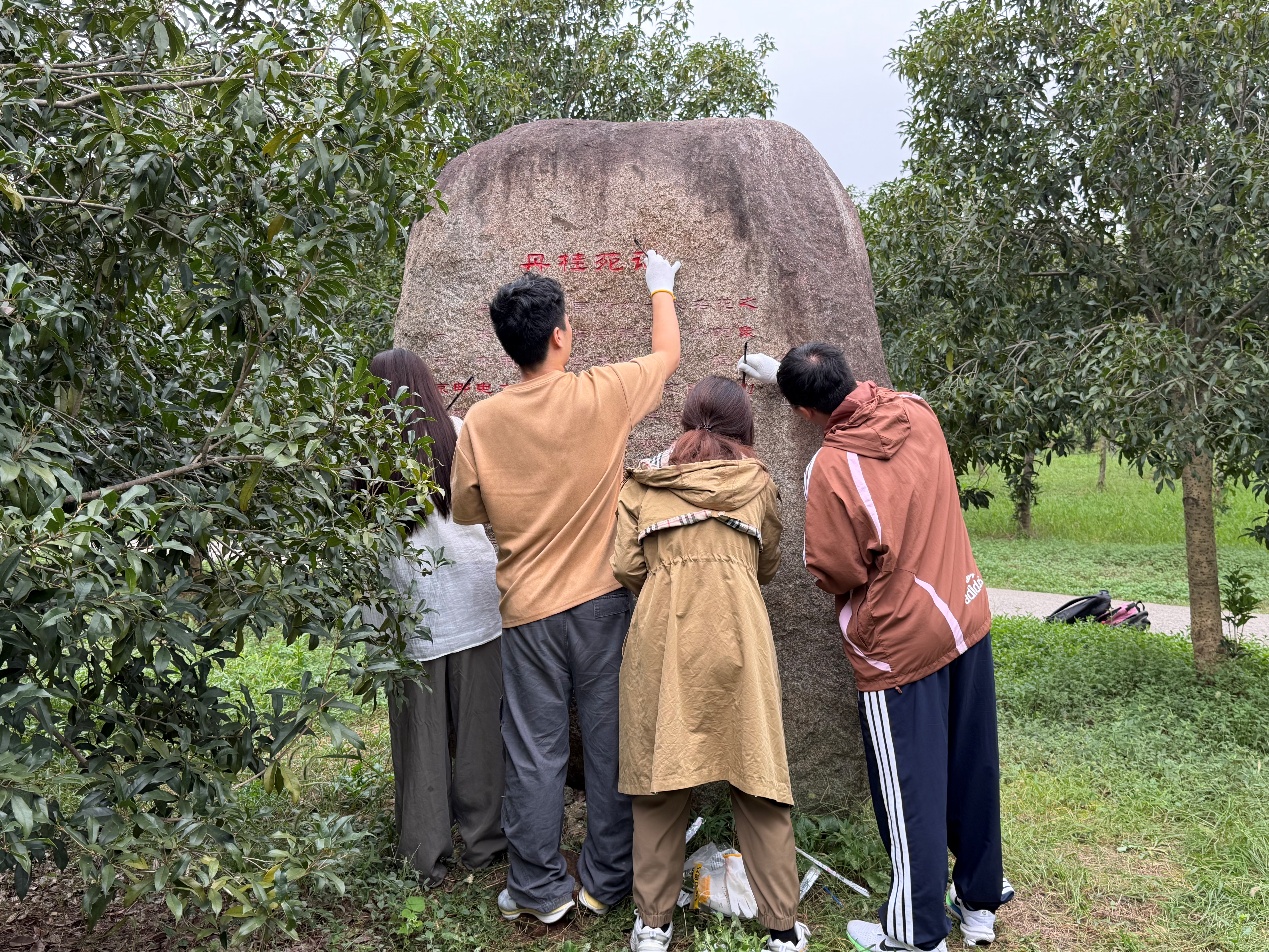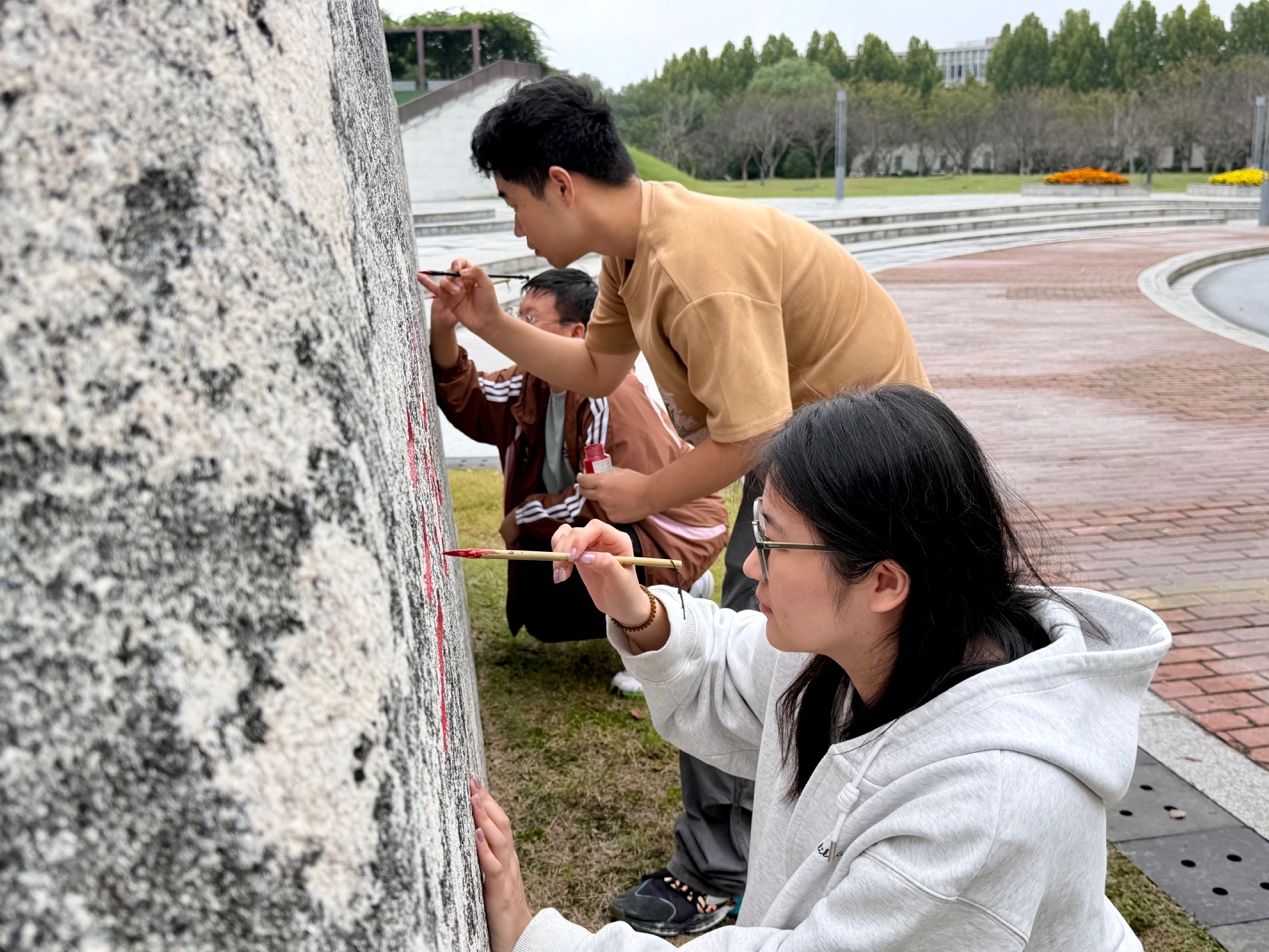 因长年日晒雨淋,战邮广场纪念碑与丹桂园石碑的油漆脱落,碑文斑驳不清。2025年10月13日,太阳成城集团tyc234cc古天乐的12名研究生、本科生志愿者,在2025级新生辅导员姚继周带领下,为战邮广场纪念碑与丹桂园石碑描字上色。本次活动是一堂鲜活生动的红色校史教育实践,也是数媒公司党委党日活动形式的一次创新尝试,新同学们在躬身实践中感悟红色校史,也增强自身对公司文化的认同。