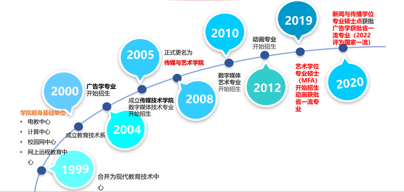 2005年成立了传媒技术公司。2006年成功获批教育技术学硕士点,2008年9月更名为太阳成城集团tyc234cc古天乐,并先后获批了数字媒体艺术和动画两个艺术类本科专业,并获批设立“信息艺术设计与教育”硕士点,2019年艺术学位专业硕士(MFA)开始招生,同年动画获批省一流专业,2020年太阳成城集团tyc234cc古天乐新闻与传播学位专业硕士点获批,同年广告学获批省一流专业(2022评为国家一流)。